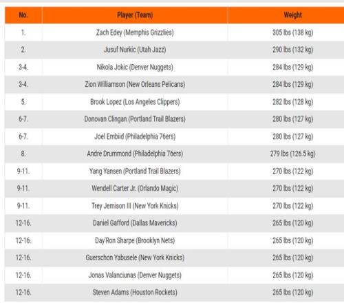 这份榜单如下:1.扎克·埃迪以305磅(约138公斤);2.努尔基奇 290磅(约132公斤);3.约基奇284磅(约129公斤)、锡安284磅(约129公斤);5.布鲁克·洛佩斯282磅(约128公斤);6.克林根280磅(约127公斤)、恩比德280磅(约127公斤);8.德拉蒙德279磅(约126.6公斤);9.杨瀚森 270磅(约122公斤)、小温德尔·卡特270磅(约122公斤)、特雷·杰米森270磅(约122公斤);12.加福德265磅(约120公斤)、戴隆·夏普265磅(约120公斤)、亚布塞莱265磅(约120公斤)、瓦兰丘纳斯265磅(约120公斤)、史蒂文·亚当斯265磅(约120公斤)。